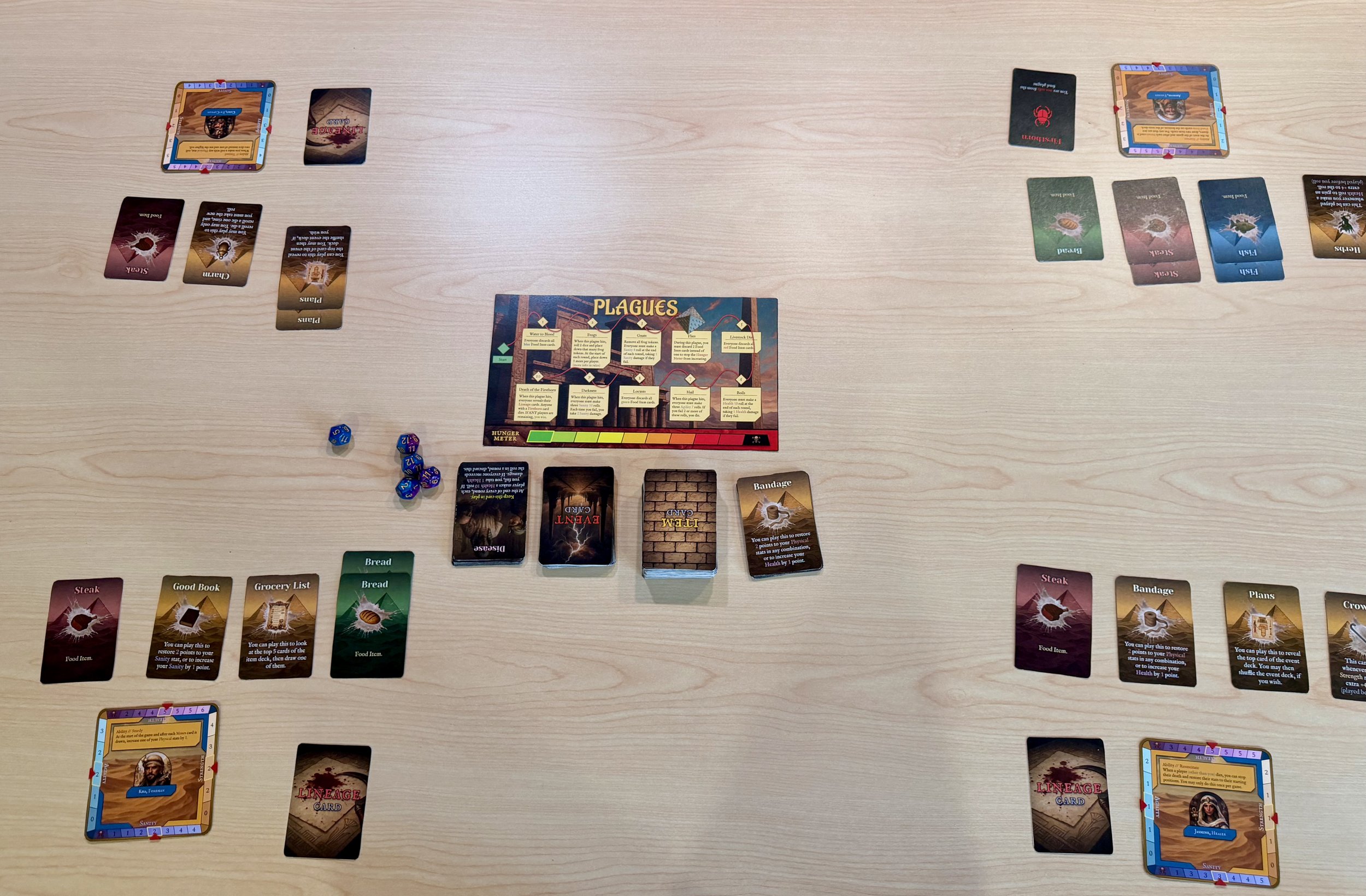 Exodus was built in a similar fashion to the Oregon Trail, in that it is a brute force team survival game where you are expected to die. I am currently working on Iteration 5 of the game, and now that I’ve gotten the gameplay loop locked down, I’m working on simplifying the game, cleaning it up, and making it more new-player accessible. I’ve had a lot of difficulty with trying to make sure that new players can understand the game, especially players that don’t understand card game terms as well. I’ve landed on a fix where I’m going to rework the rules entirely, adding images and making it easier to trace what does what- on top of adding the gameplay loop to the plague board (the game board) for quick reference. I expect the game to be ready for release in late 2026 or early 2027.
